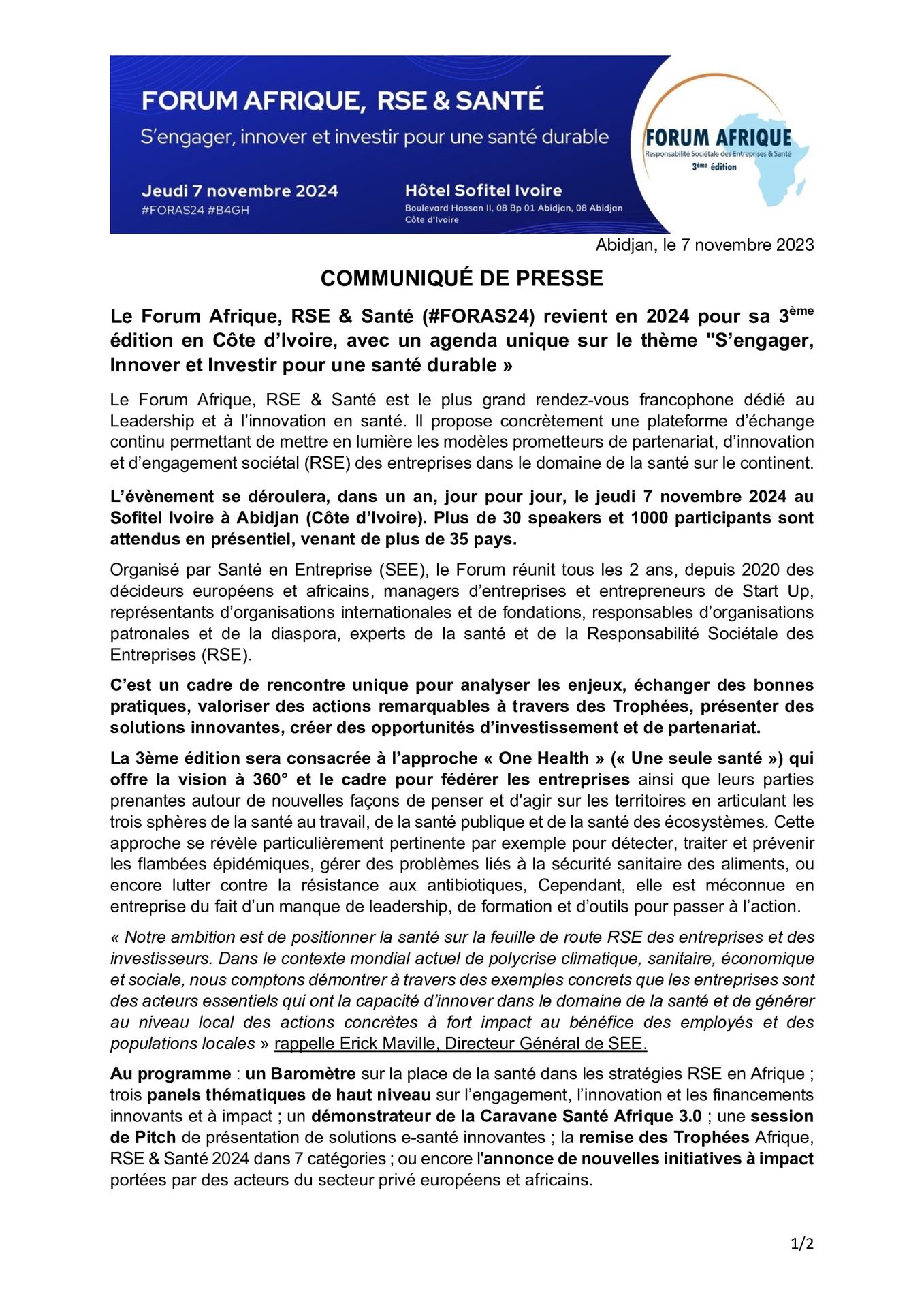 Communiqué de presse - Forum Afrique, RSE & Santé 2024